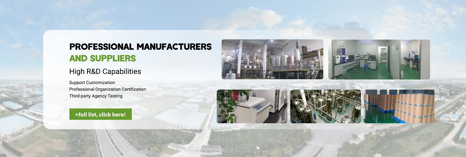 Fruiterco heeft een complete productielijn voor extractie, scheiding en zuivering, die meer dan 1,000 ton grondstoffen kan verwerken en meer dan 150 ton standaardextracten en verschillende grondstoffen met een hoge zuiverheid kan produceren. Met zijn complete testmethoden en strikte kwaliteitscontrolemaatregelen worden onze hoogwaardige producten geëxporteerd naar meer dan 100 landen over de hele wereld, waaronder de Verenigde Staten, Canada, het Verenigd Koninkrijk, Frankrijk, Australië, Japan, Zuid-Korea, Maleisië, Brazilië en Turkije. Wij kijken uit naar de samenwerking!
